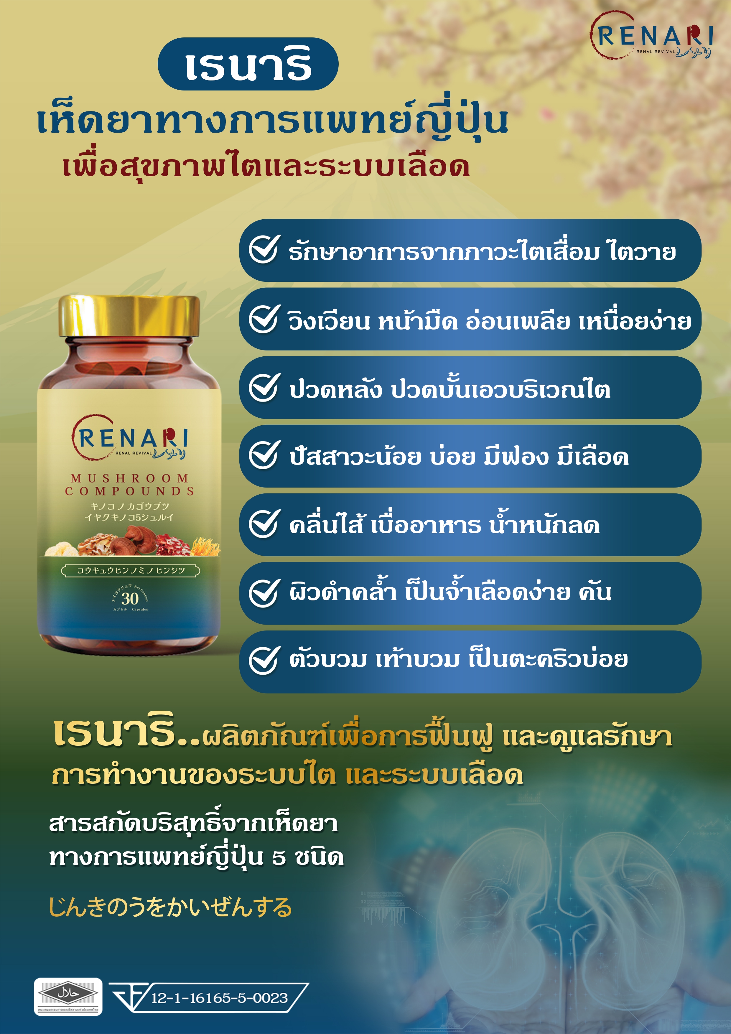 Renari เรนาริ เห็ดยาทางการแพทย์ ญี่ปุ่น 5 ชนิด ผลิตภัณฑ์เพื่อการฟื้นฟู และดูแลรักษาระบบไต และระบบเลือด