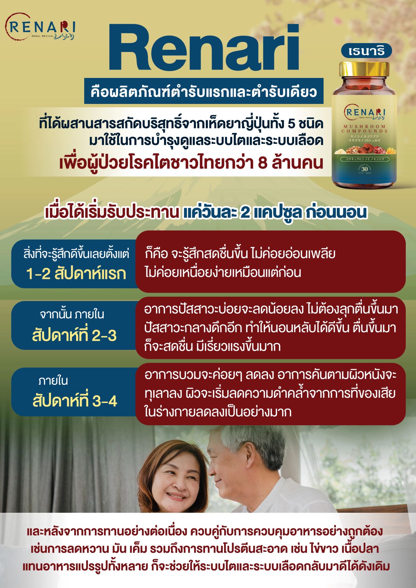 เรนาริ สามารถช่วยลดอาการต่างๆ จากโรคไต เช่นตัวบวม, ปวดหลัง, วิงเวียนศีรษะ, อ่อนเพลีย, ฉี่เป็นฟอง